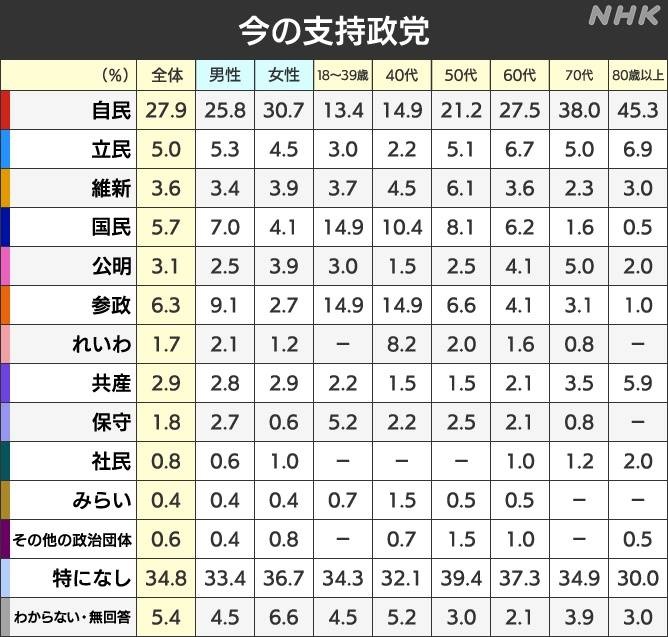 政党支持率 自民27.9% 参政6.3% 国民5.7% 立民5.0% | NHK