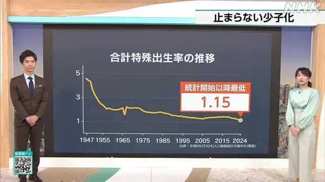 出生率 過去最低 止まらない少子化“結婚の減少“も要因|NHK 首都圏のニュース【NHK】去年1年間に生まれた日本人の子どもの数は68万6000人あまりと、前の年より4万1000人あまり減少し、統計を取り始めて以降、初めて70万…www3.nhk.or.jp - 3 : 2025/07/15(火) 18:23:17.41 ID:WUGOT/yv0
