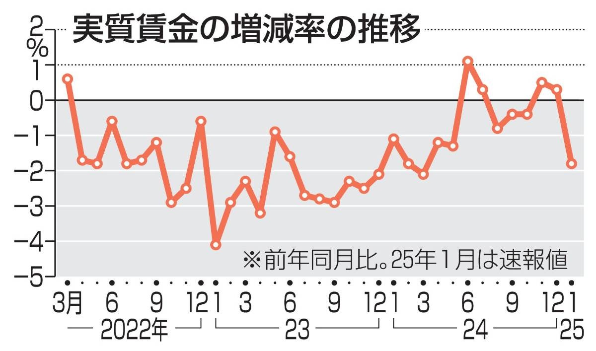 1月の実質賃金、1.8%減 3カ月ぶりマイナス、物価高加速厚生労働省が10日公表した1月の毎月勤労統計調査(速報、従業員5人以上)によると、物価変動を考慮した1人当たりの実質賃金は前年同月比1.8%減で、3カ月ぶりのマイナスとなった。コメや生鮮野菜など食料 ...www.47news.jp - 4 : 2025/03/11(火) 08:02:32.485 ID:XaX38Iodx