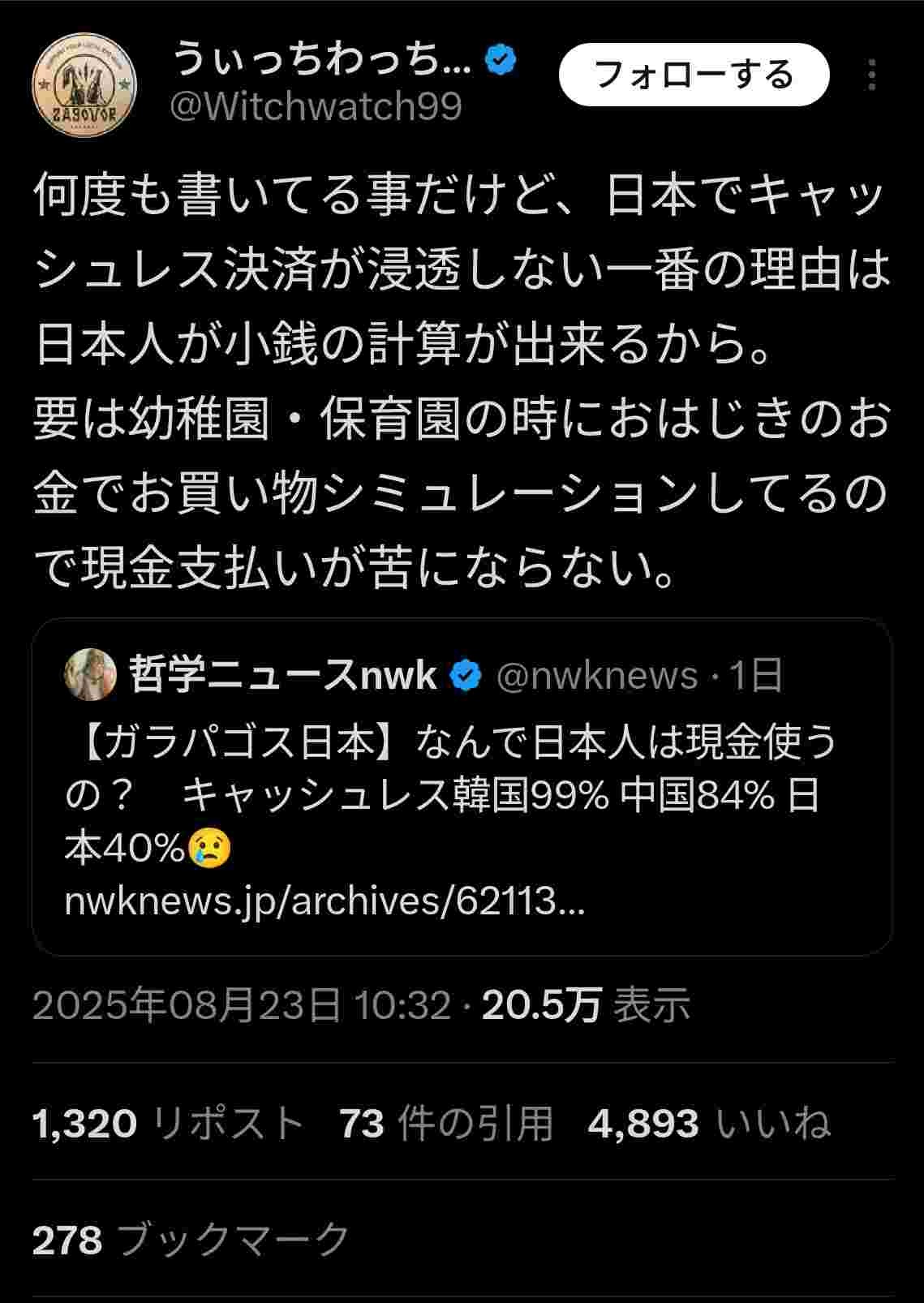 あとケチな民族なのにキャッシュレスを使わない理由がない - 10 : 2025/08/23(土) 22:34:17.56 ID:grizrBb90