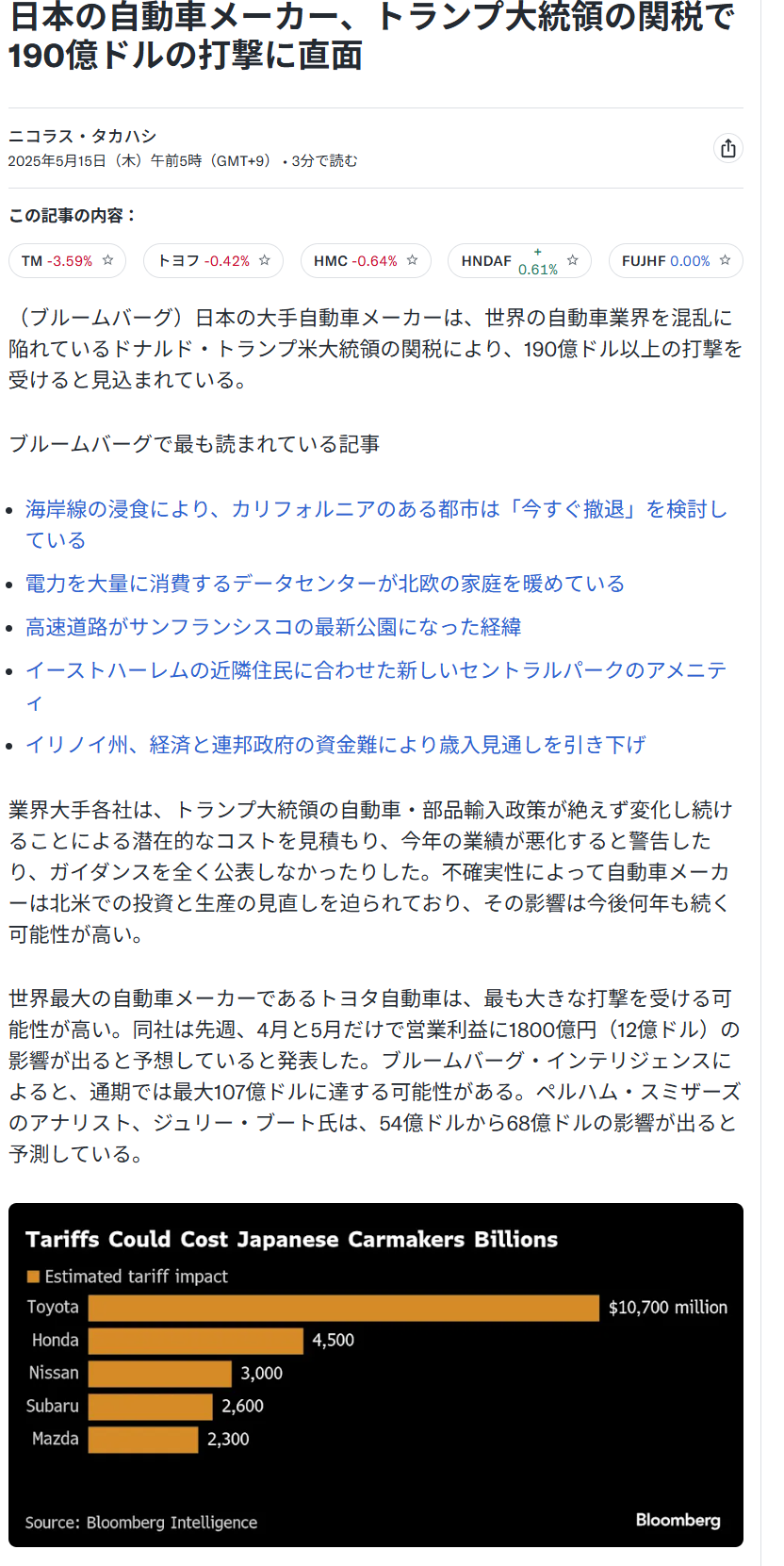 日本の自動車メーカー、トランプ大統領の関税で190億ドルの打撃、影響は今後何年も続く可能性