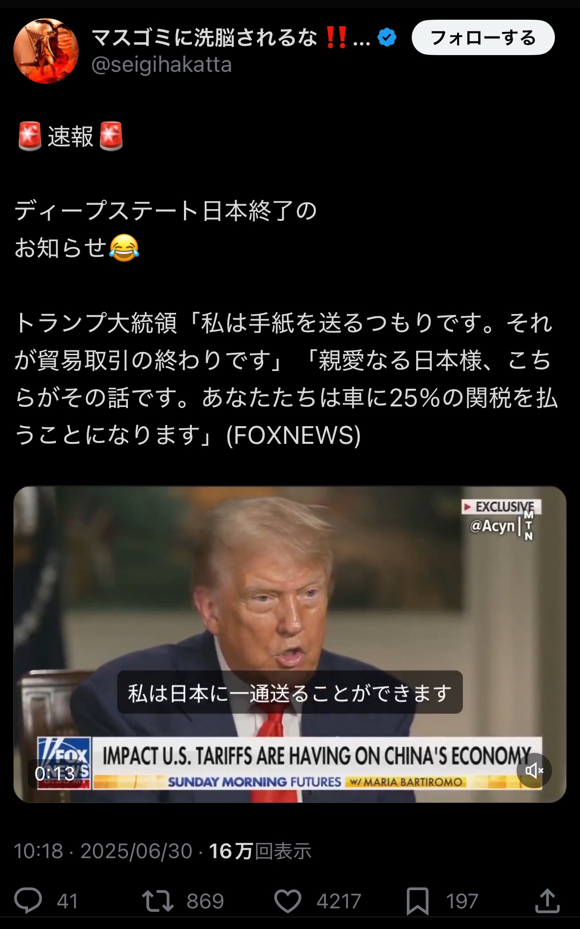 トランプ氏「親愛なる日本様、車の関税は25%」「これで貿易協定終わりと手紙送る」…FOXで発言
