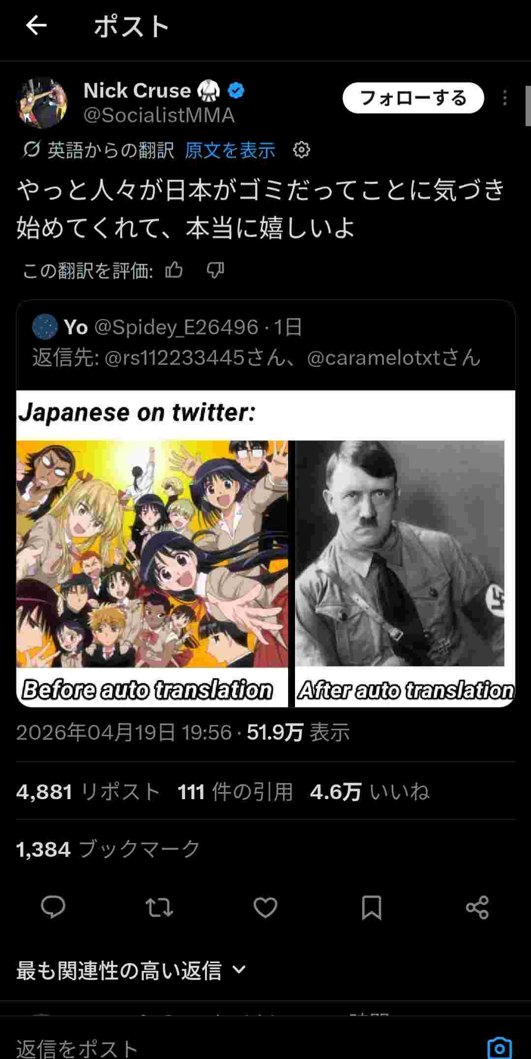 外国人もいちいち日本人のX覗くなよ - 6 : 2026/04/20(月) 08:44:44.871 ID:tcRhwWlQ0