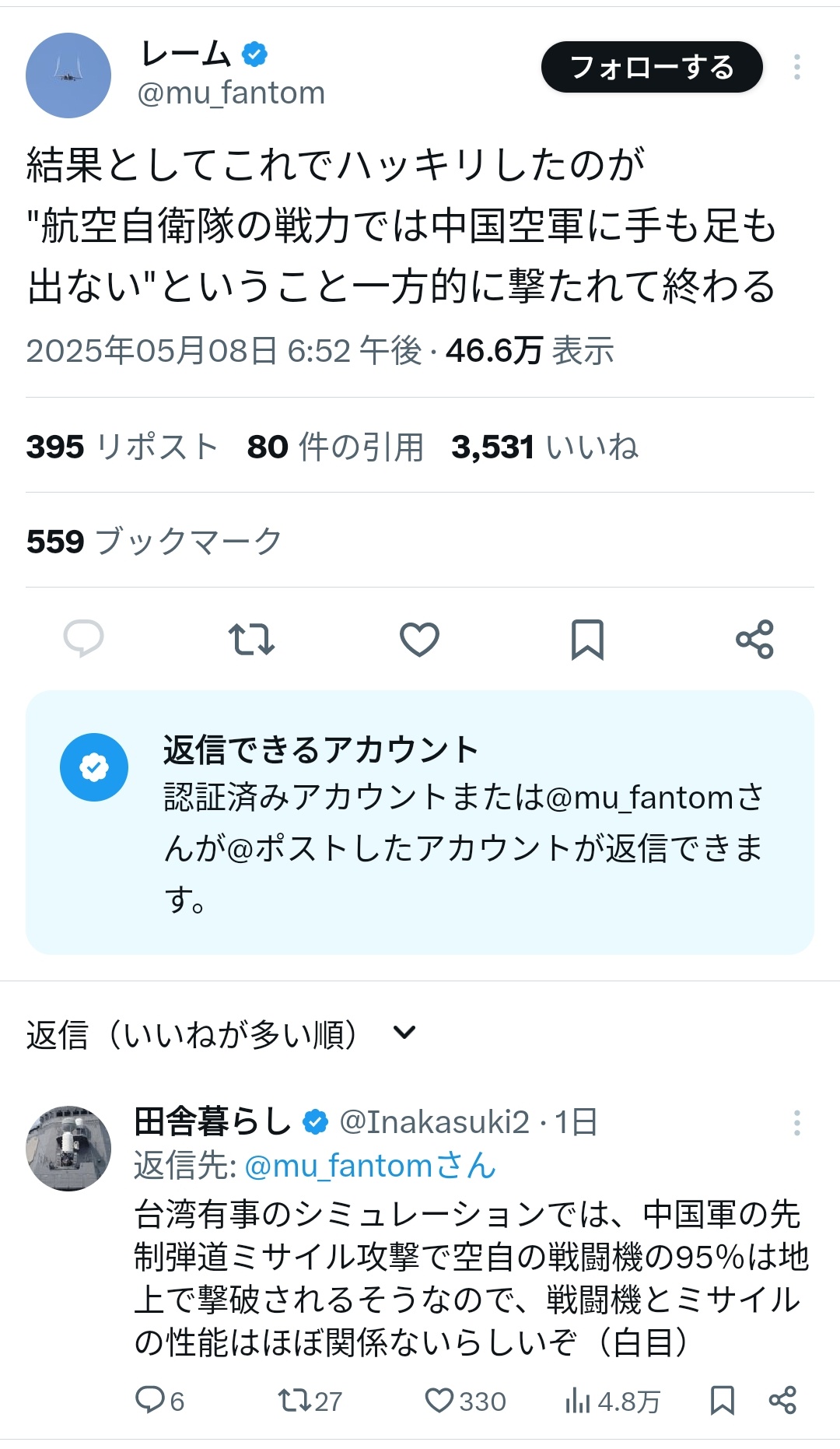 軍事界隈のTwitterでは、戦闘機よりも、中国軍のPL-15長距離空対空ミサイルの性能が実戦で明らかになったことのほうが騒がれている。(というのも、西側にはこのミサイルを超えるAIM-174B(SM-6の空中発射版)や開発中のAIM-260があるものの、まだ数が揃っておらず、すでに量産されているPL-15が実戦で戦闘機(鈍重なAWACSなどではなく)を撃ち落としたという事実は、台湾有事が起こった際、西側戦闘機が容易に中国軍に近づけないという事実を補強してしまったから。特に戦闘機を撃ち落としたということは、機動性に劣る空中給油機やAWACSの場合、より撃ち落とされる可能性が高い=射程内には近づけない=作戦に支障がでる)