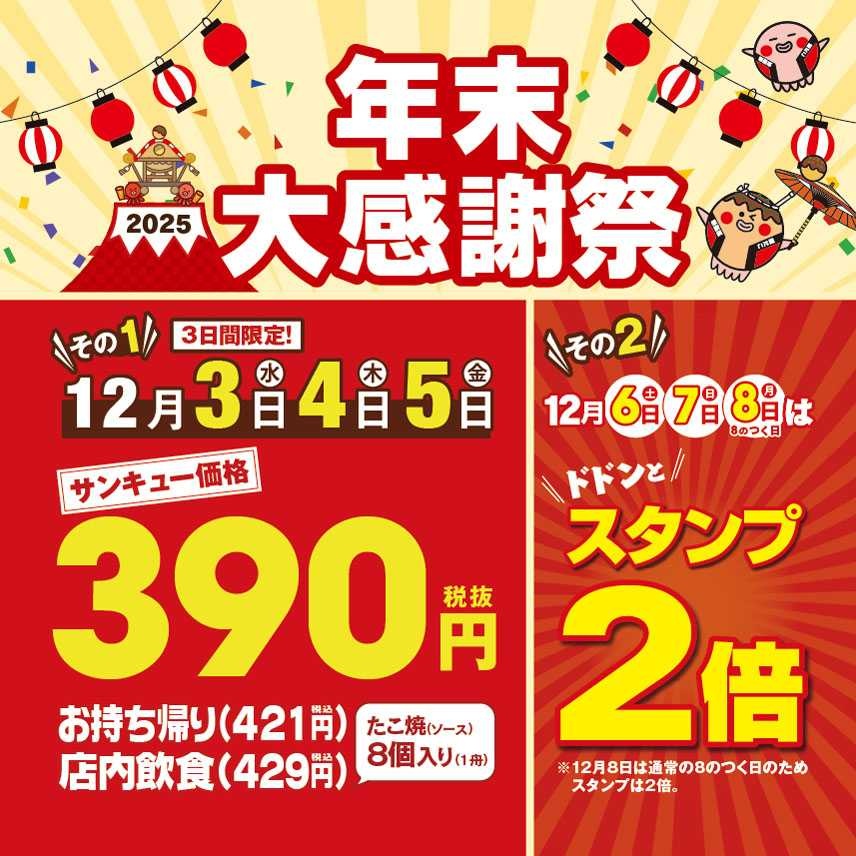 【 銀だこ たこ焼1舟390(サンキュー)価格!!】1年の感謝を込めた 『年末大感謝祭』 12/3(水)より開催!