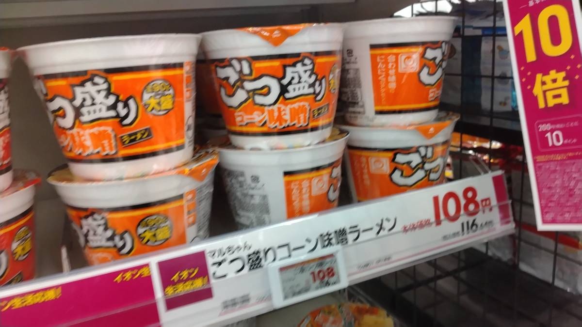 - 醤油と味噌が税込み190円で味噌コーンとワンタン麺と豚骨と醤油豚骨だけ108円だけど売り尽くして全て190円にするのかな