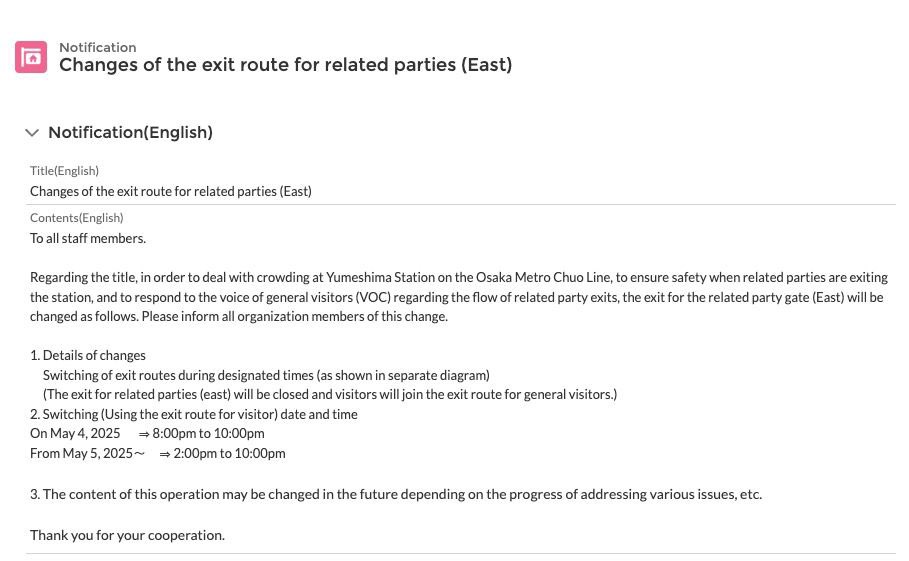 標題の件につきまして、大阪メトロ中央線夢洲駅の混雑対策、関係者退出時の安全確保、関係者退出動線に関する一般来場者(VOC)の声にお応えするため、関係者出入口(東)を下記のとおり変更いたします。 つきましては、関係者出入口(東側)を下記の通り変更いたしますので、関係者の皆様にお知らせくださいますようお願い申し上げます。
