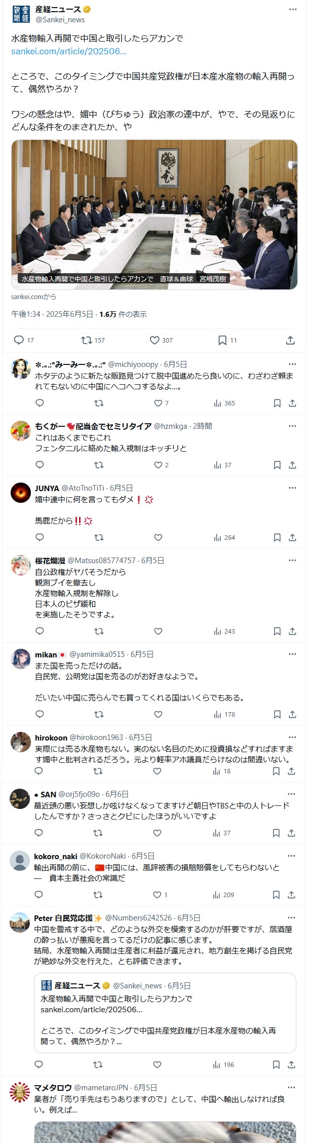 「中国政府はジャップ水産物の輸入止めて国民の健康安全を守る」って結局ただのディールだったの?って思うよねw - 60 : 2025/06/30(月) 09:35:39.33 ID:ht8DN5Xl0