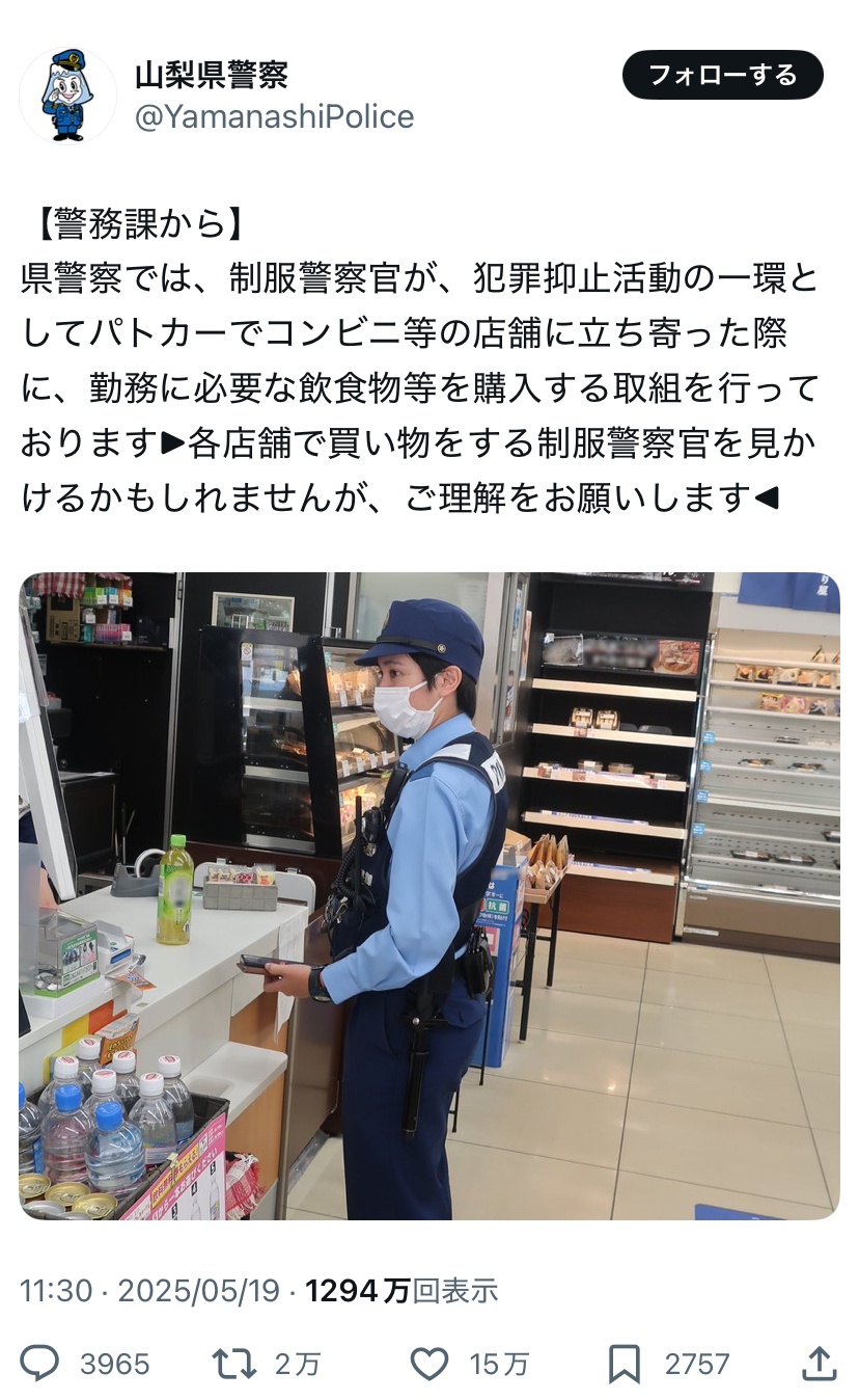 日本人「警官がコンビニ行ってる💢」警察「我々もコンビニくらい行きます👮‍♂」