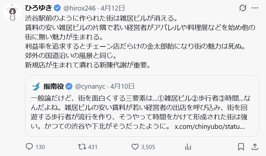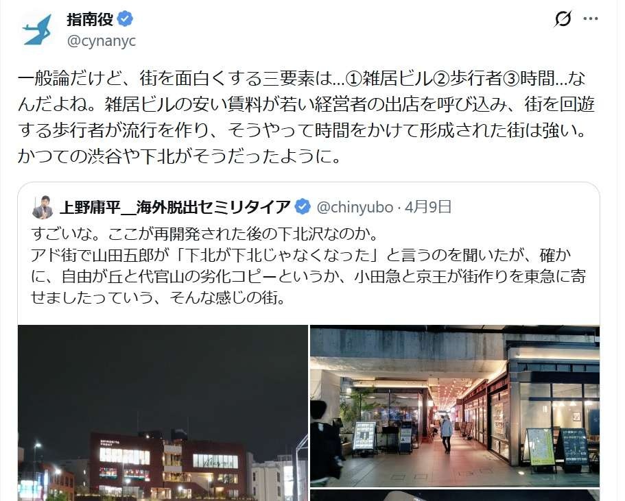 代官山みたいとか言ってるけど、代官山って雑居ビルというかちょい古いマンションで店開いたりしててアングラなおもしろさあるよ