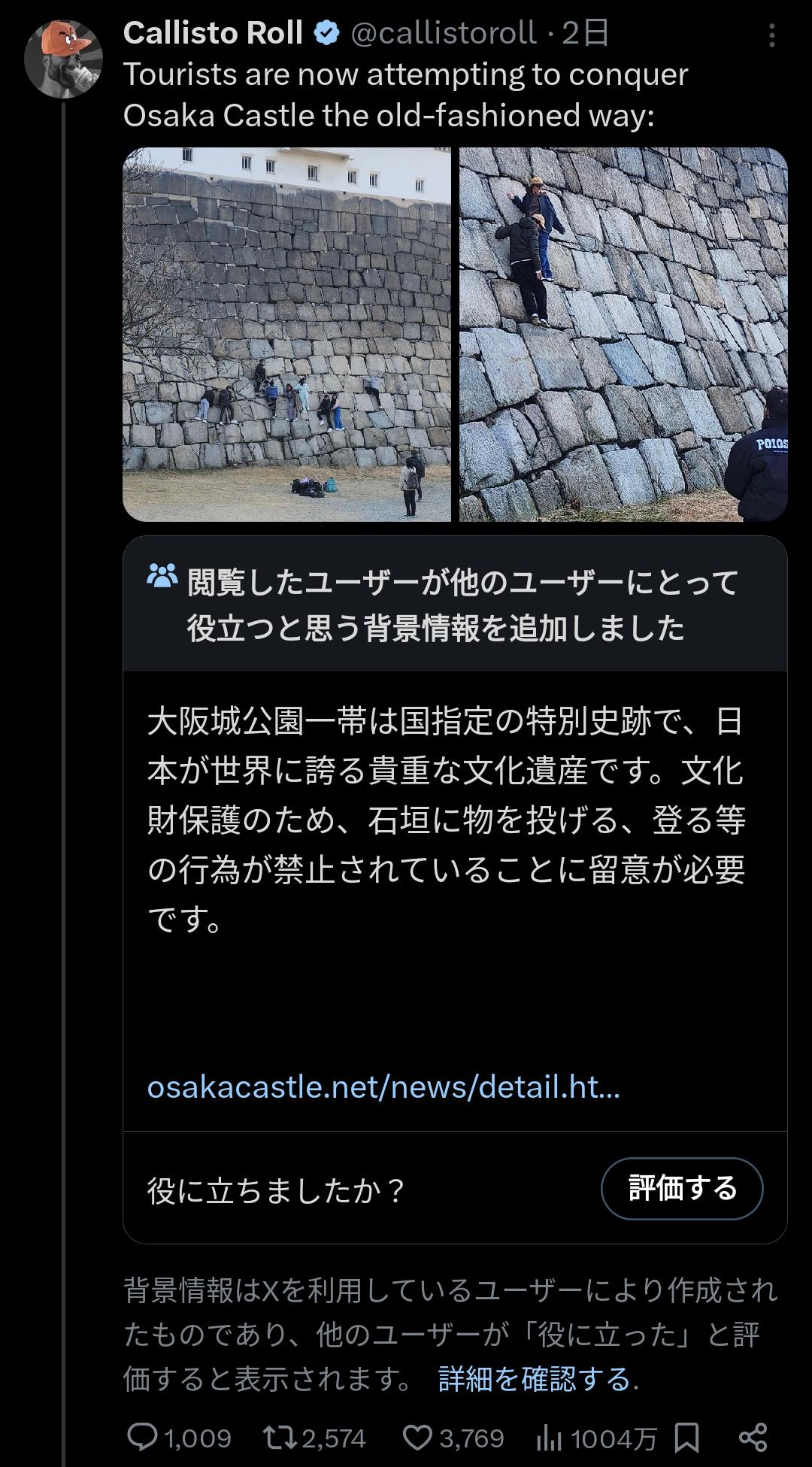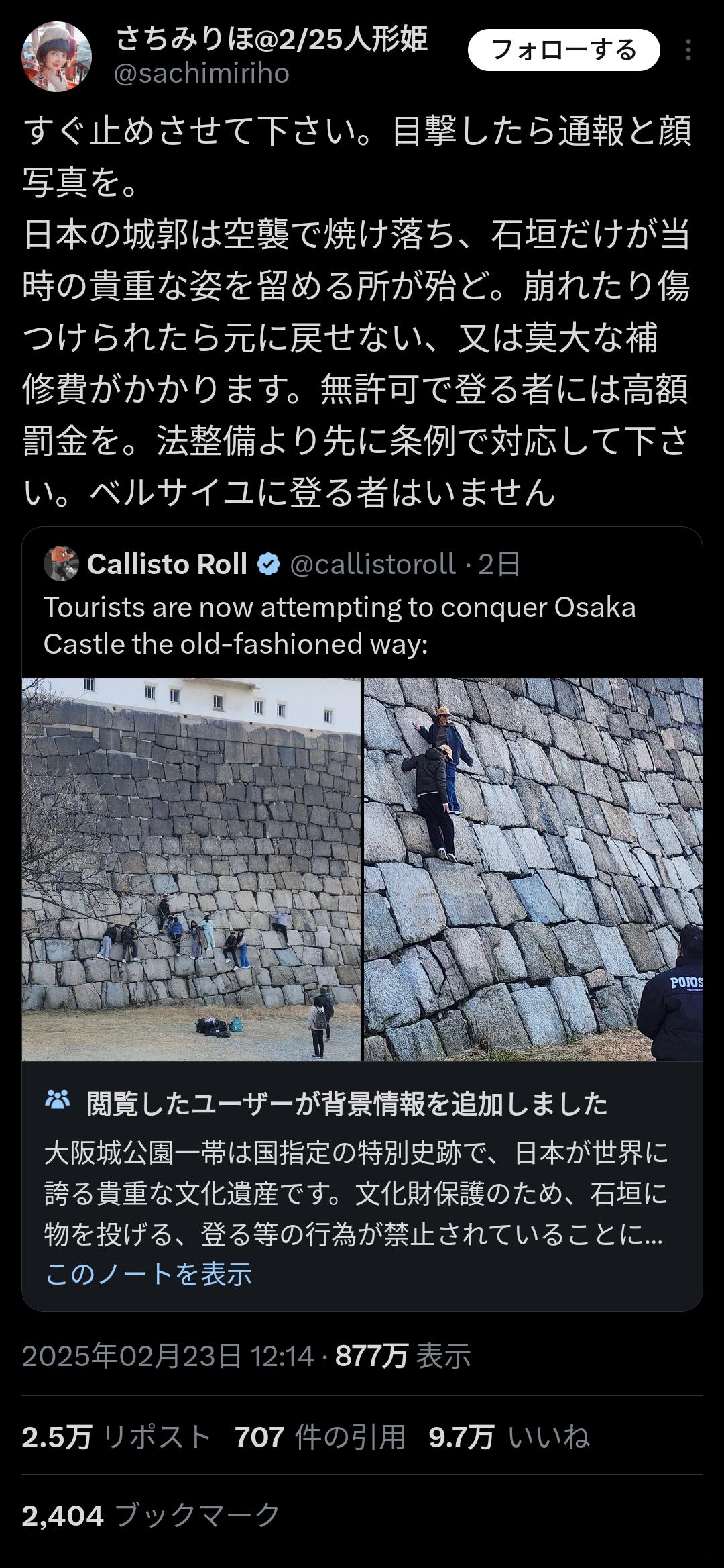 石垣はこの程度では崩れて無いけど故意に傷つけてるわけだから文化財保護法違反だし、禁止されてる堀に登ったなら建造物侵入罪だそ