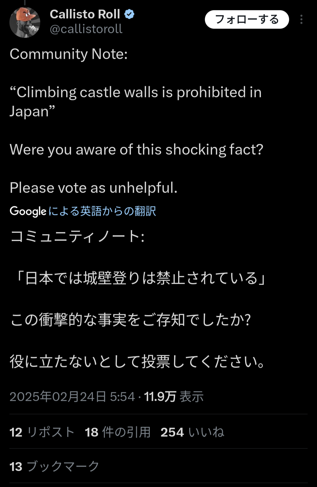 人が登ったくらいで崩れる城壁なんか危ないから解体しろ