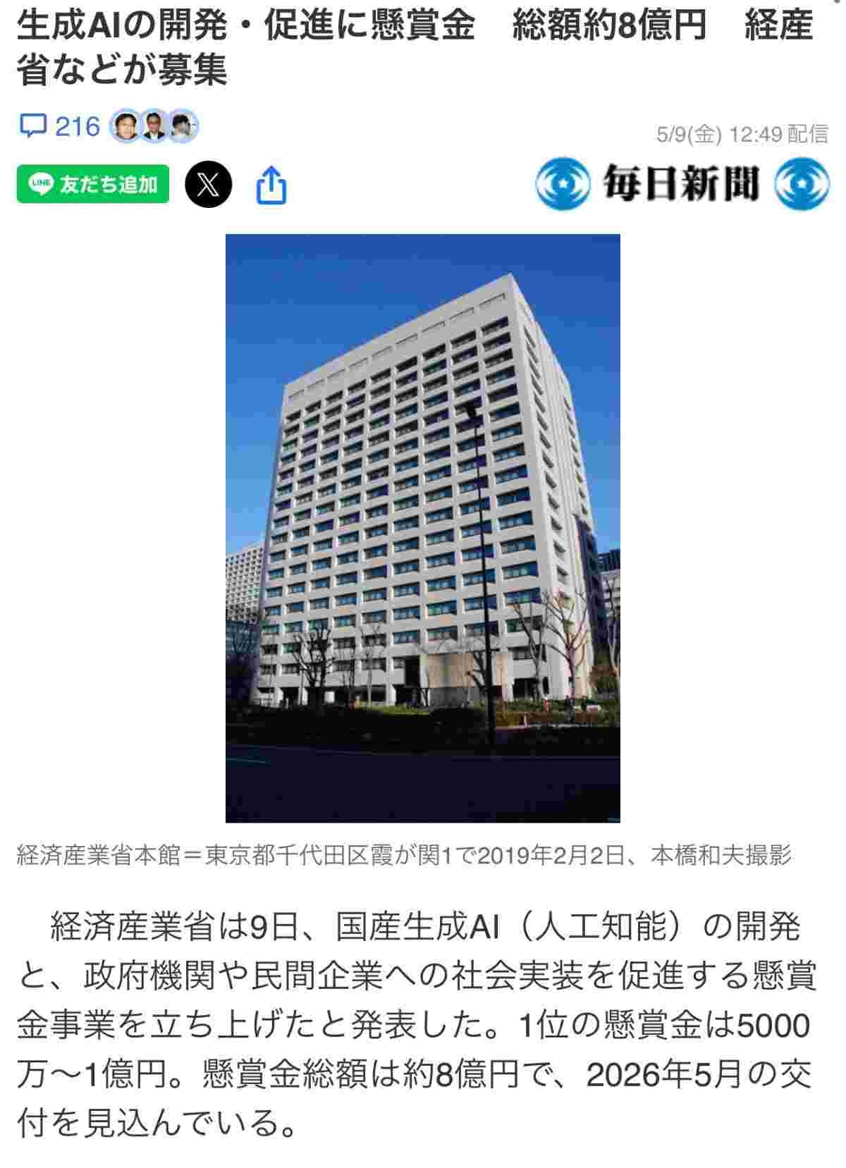 - AI産業全体への投資とか支援の話じゃなくて、ただの懸賞金だから低いのは分かるがそれでも8億はどうなんだ