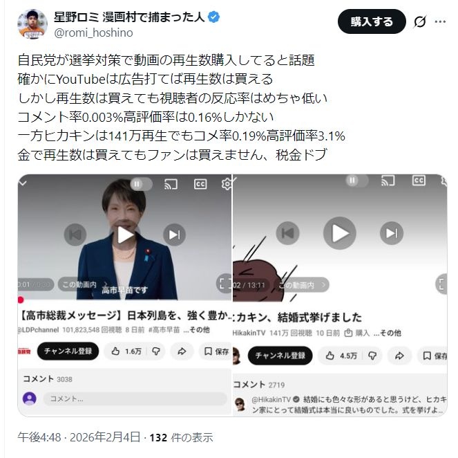 星野ロミ「自民党が選挙対策で動画の再生数購入、再生数は買えても視聴者の反応率はめちゃ低いコメント率0.003%高評価率は0.16%
