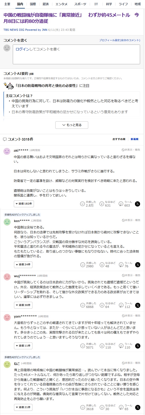普通の日本人「中国にへこへこする日本の政治家達情けない😖中国の戦闘機を撃ち落とせるようにしとけ😡」