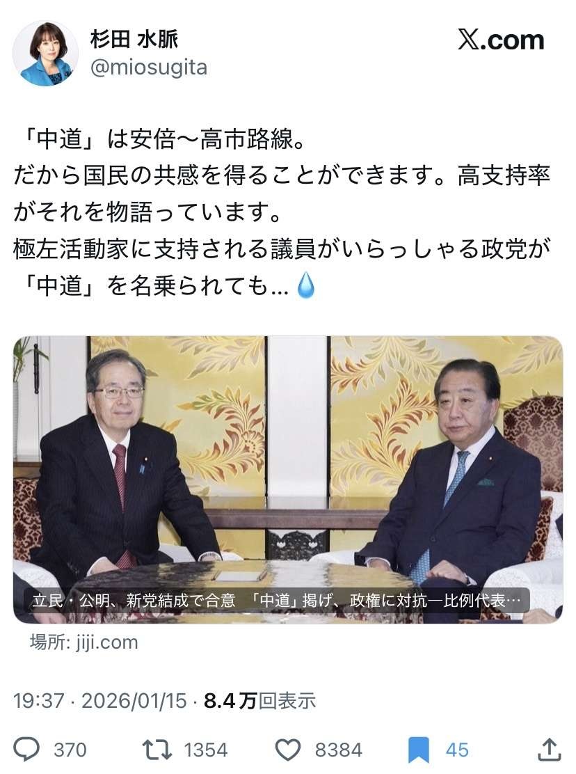 杉田水脈「中道は安倍・高市路線。極左に支持される政党が名乗るな」