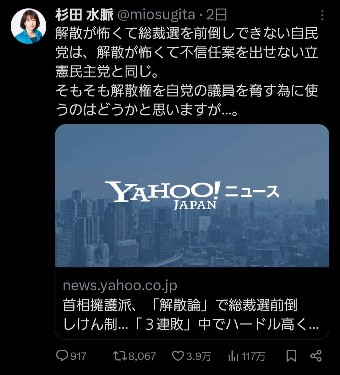 杉田水脈さん「解散が怖くて総裁選を前倒しできない自民党は、解散が怖くて不信任案を出せない立憲民主党と同じ」