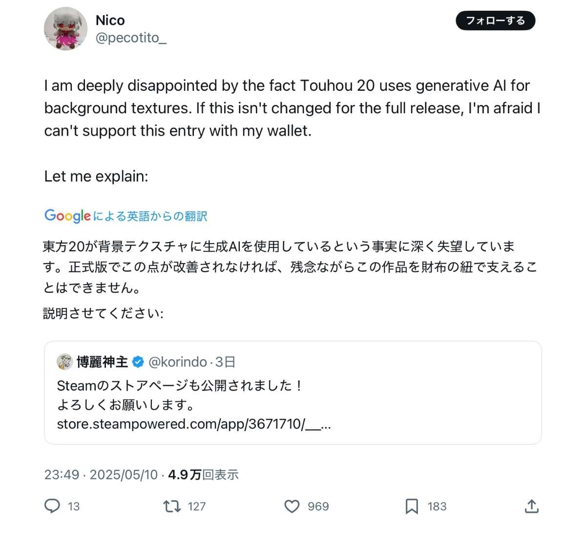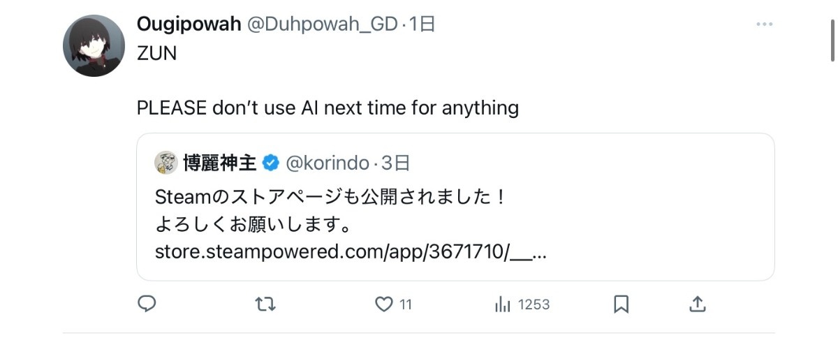 - 東方の背景テクスチャとかいう誰からも評価されてない物にAI使われたからなんなんだよ