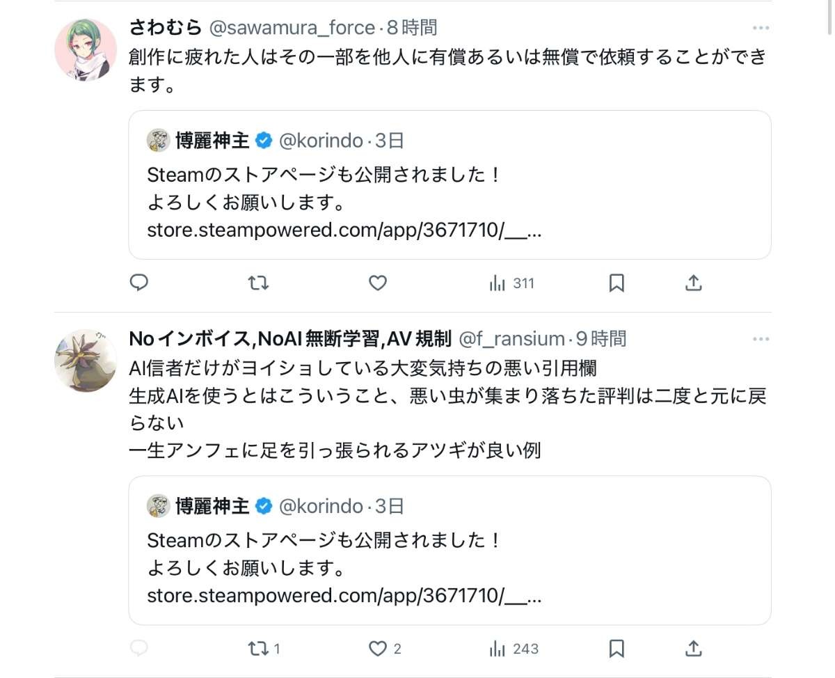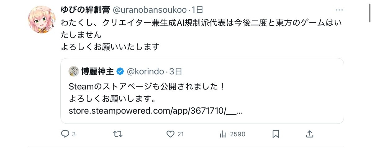 - 反AI界隈も「東方は好きだからセーフ♡」と「東方だろうとアウト」の2派に分かれてるらしい
