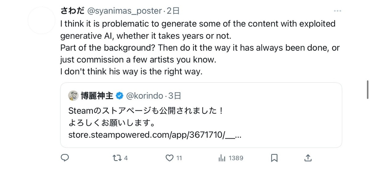 - AI使われて嫌なのってキャラデザシナリオ音楽位やろ
