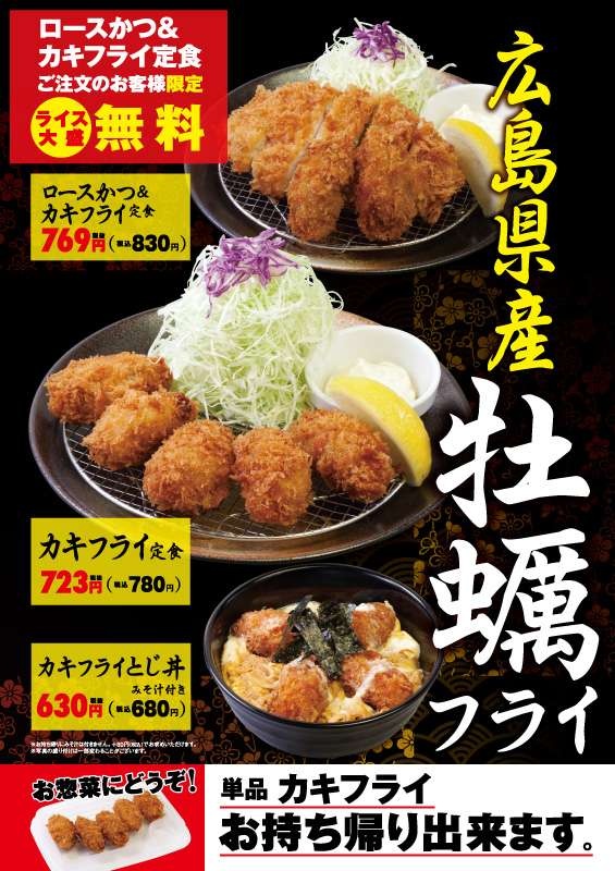 「アジフライ」と「カキフライ」の2種の海鮮フライは、同店では期間限定で度々しており、隠れた人気メニューなんだとか。今回、「アジフライ定食」「カキフライ定食」をはじめ、ロースかつとの組み合わせや海鮮盛合せなど、バリエーション豊かなラインナップで復活します。