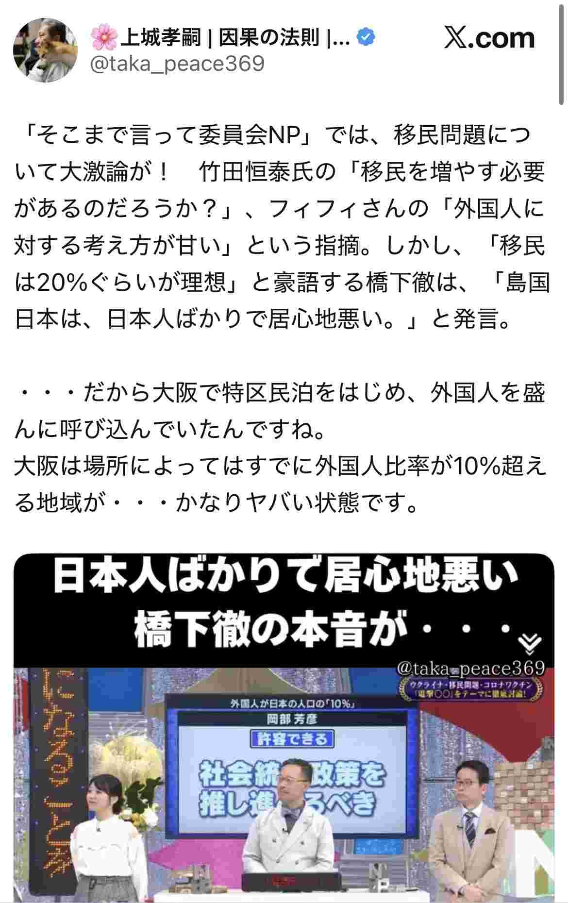 橋下徹「島国日本は日本人ばかりで居心地悪い」