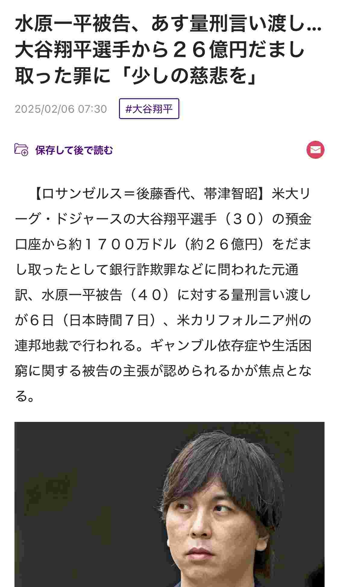 - 米大リーグ・ドジャースの大谷翔平選手(30)の預金口座から約1700万ドル(約26億円)をだまし取ったとして銀行詐欺罪などに問われた元通訳、水原一平被告(40)に対する量刑言い渡しが6日(日本時間7日)、米カリフォルニア州の連邦地裁で行われる。
