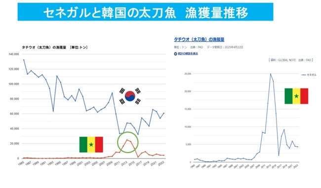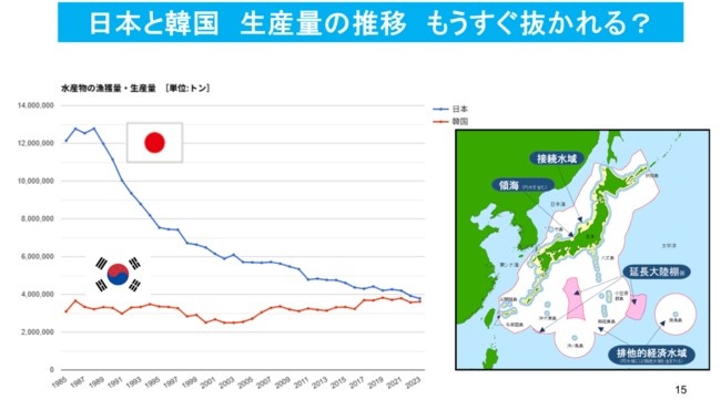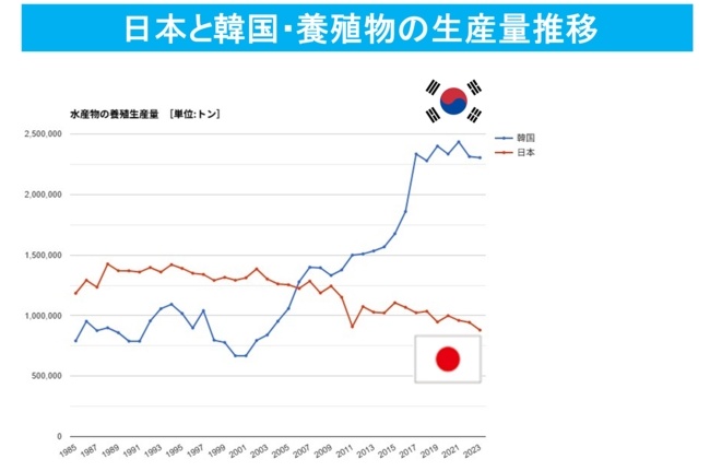 広さを誇ります。韓国はわずか48万㎢で日本の10分の1に過ぎません。ところがその韓国に上の左のグラフの通り、水産物の生産量で肉薄されています。23年が最新の数字なのですが、