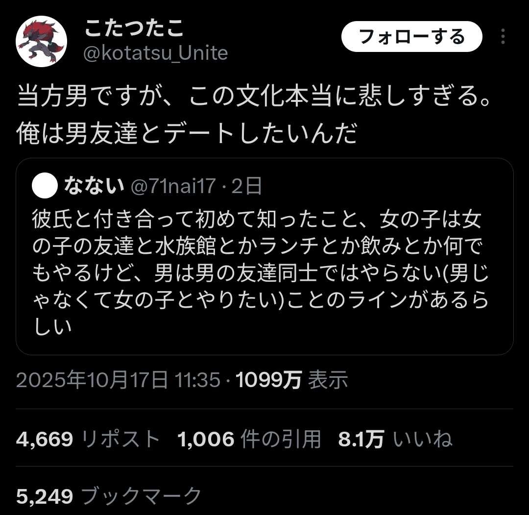 ちなみに女からはそういう無駄な制限設けてるせいで男の感受性が低いだの社会性がないだの教養が低いだの年取ると孤独になる原因だのボロクソ言われてる