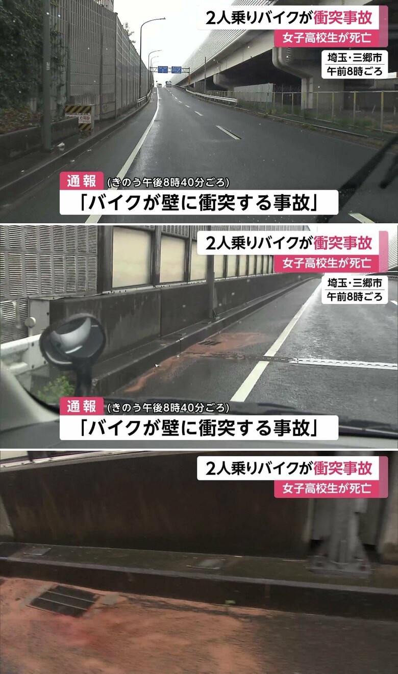 埼玉県三郷市で2日、2人乗りのバイクが縁石と衝突し、後ろに乗っていた女子高校生(17)が死亡し、バイクを運転していた17歳の男性も軽い怪我をしました。