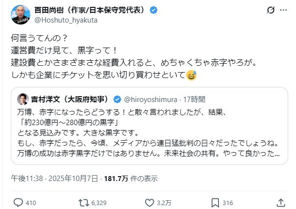 百田尚樹「運営費だけ見て、黒字って!建設費とかさまざまさな経費入れると、めちゃくちゃ赤字やろが」→万博、280億円の黒字