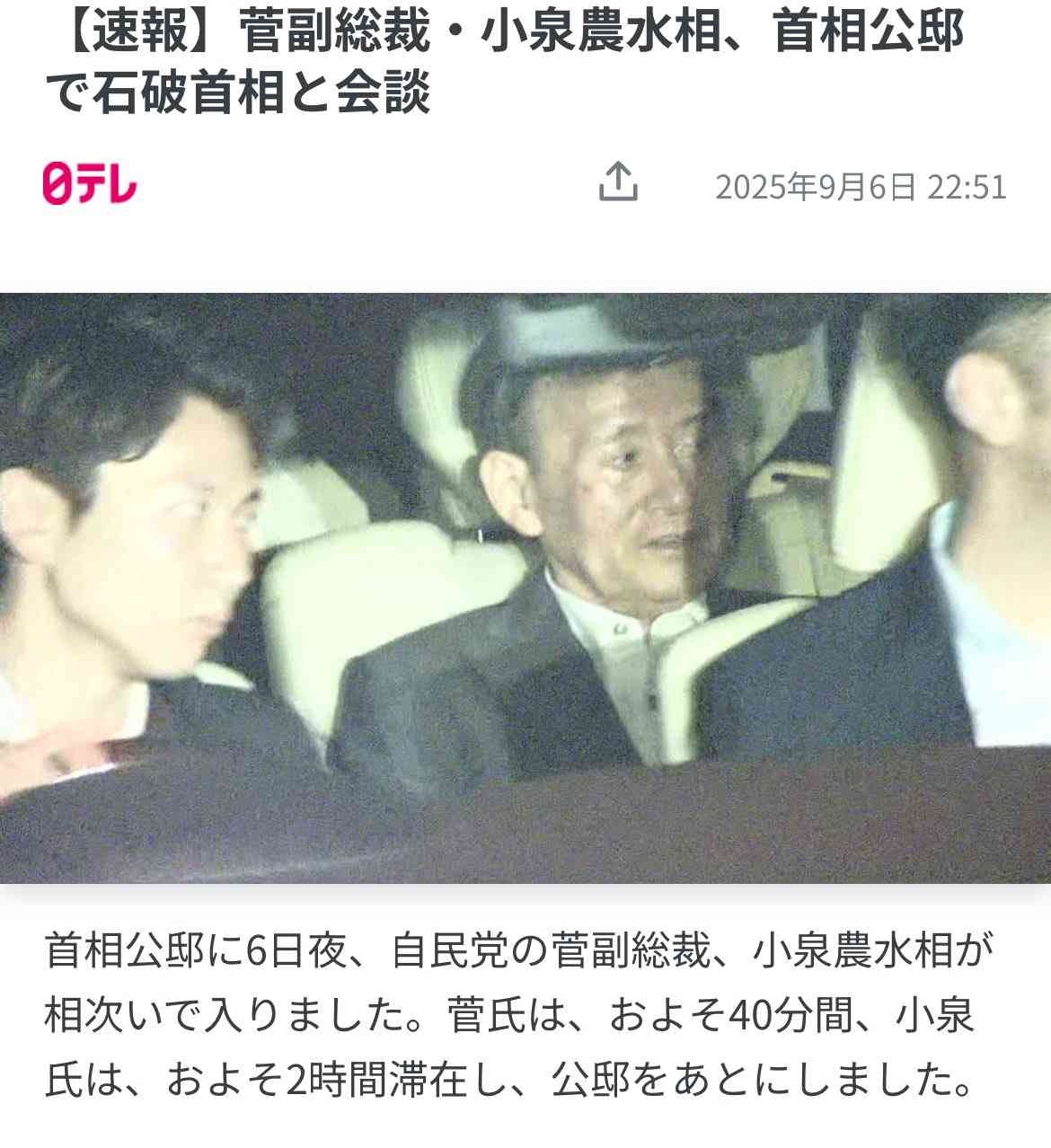 石破・菅・進次郎の会談時間は3時間!これ説得されたけど「ワイ絶対辞めへん」って駄々こねたパターンだろ😱