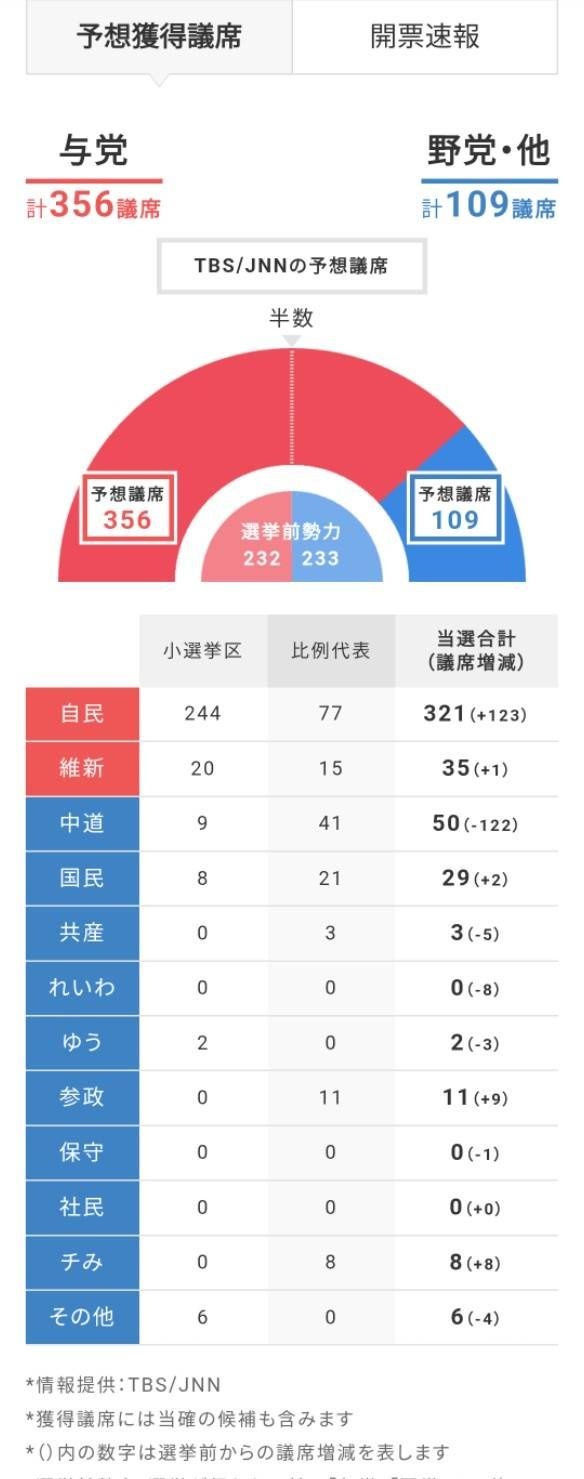 - むしろ中道が50議席も取ってるのが驚きなんだけど