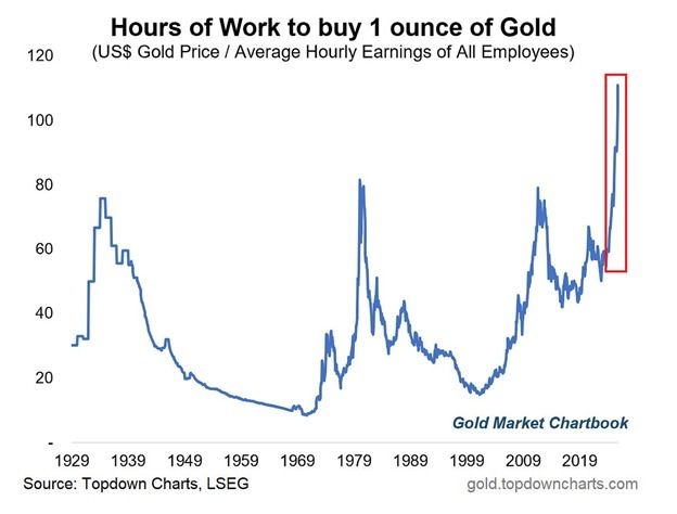 金の購入がアメリカでかつてないほど困難になっています。現在、1オンスの金を手に入れるには116時間働く必要があり、少なくとも過去100年で最も長い時間です。これは、金価格が約4,225ドルと史上最高値で取引される一方、8月の平均時給が36.50ドルにとどまっていることによるものです。この比率はわずか18か月で倍増しており、金価格の上昇が所得増加を大きく上回っています。過去のピークである1930年代、1980年、2011年の約80時間を超え、2000年代初頭には1オンス購入に20時間未満しか必要なかったことと比べても大きな上昇です。金の値上がりは想像以上に急激です。