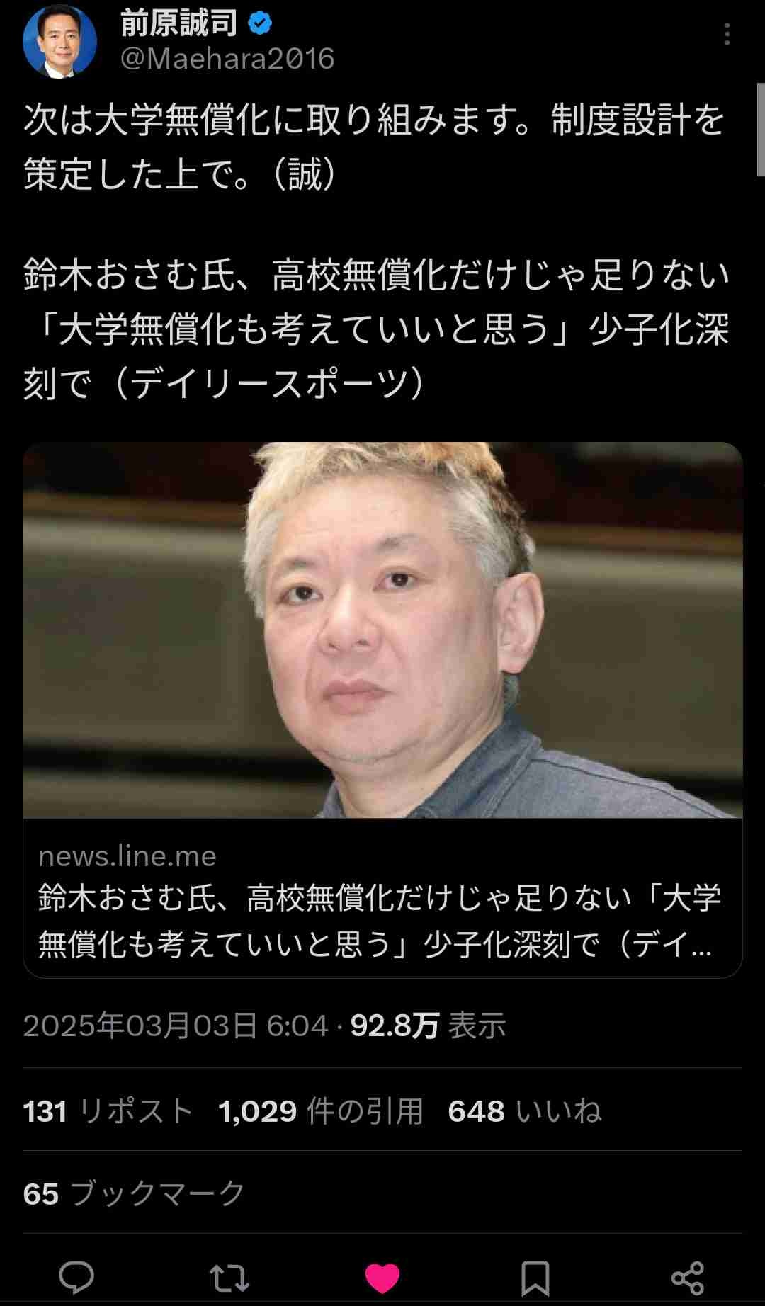 - 無償化ってより無利子の奨学金の拡大から始めたら?