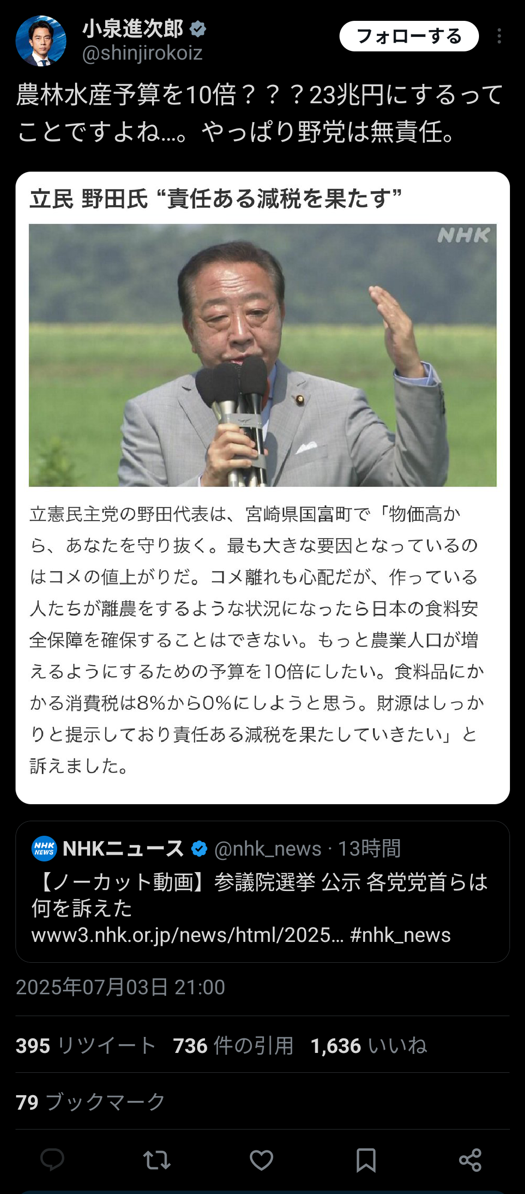 農林水産予算を10倍???23兆円にするってことですよね…。やっぱり野党は無責任。