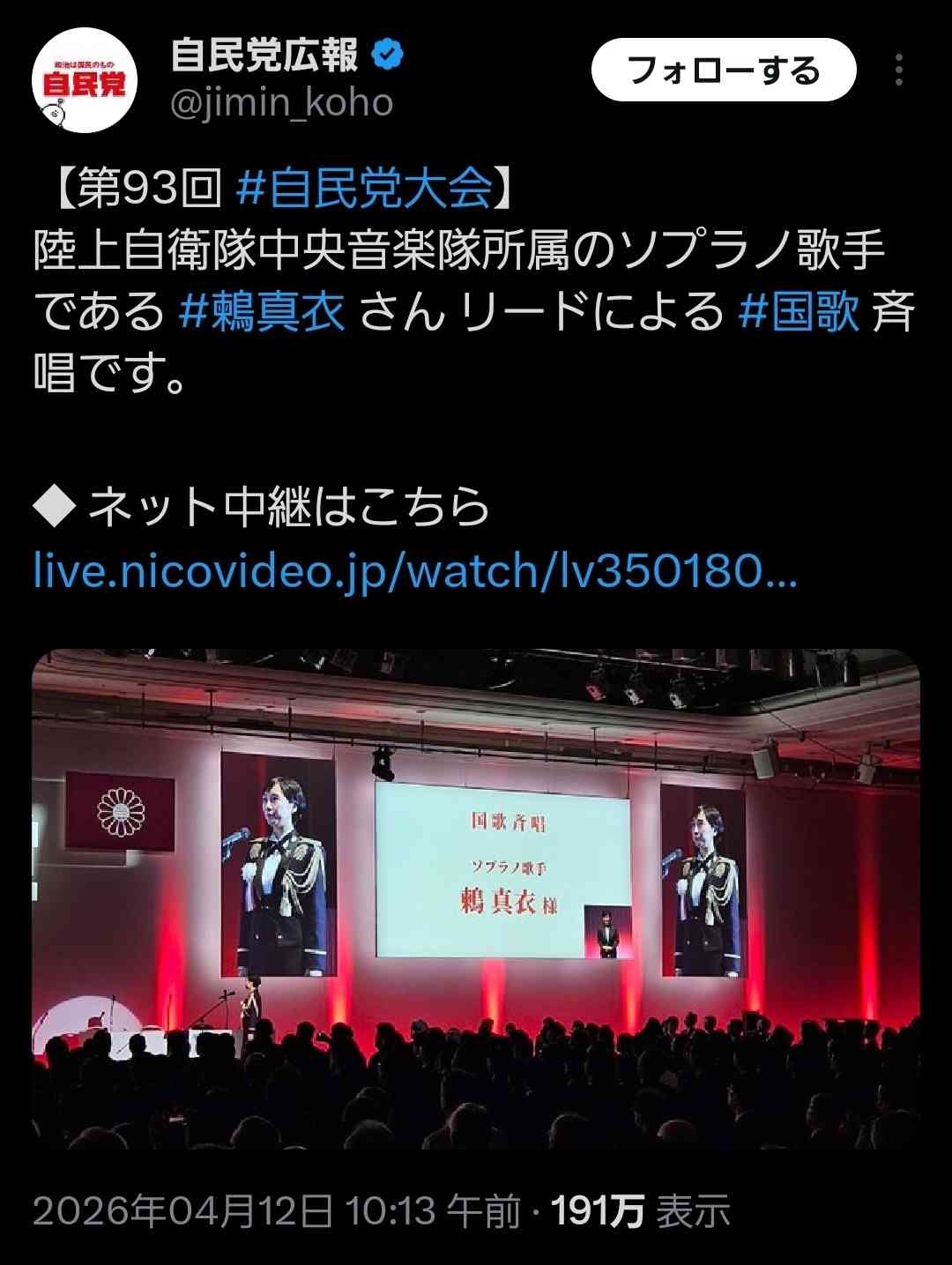 自民党広報 (@jimin_koho) on X【第93回 #自民党大会】 陸上自衛隊中央音楽隊所属のソプラノ歌手である #鶫真衣 さん リードによる #国歌 斉唱です。 ◆ ネット中継はこちらx.com - 41 : 2026/04/13(月) 18:23:27.50 ID:keS9bceod