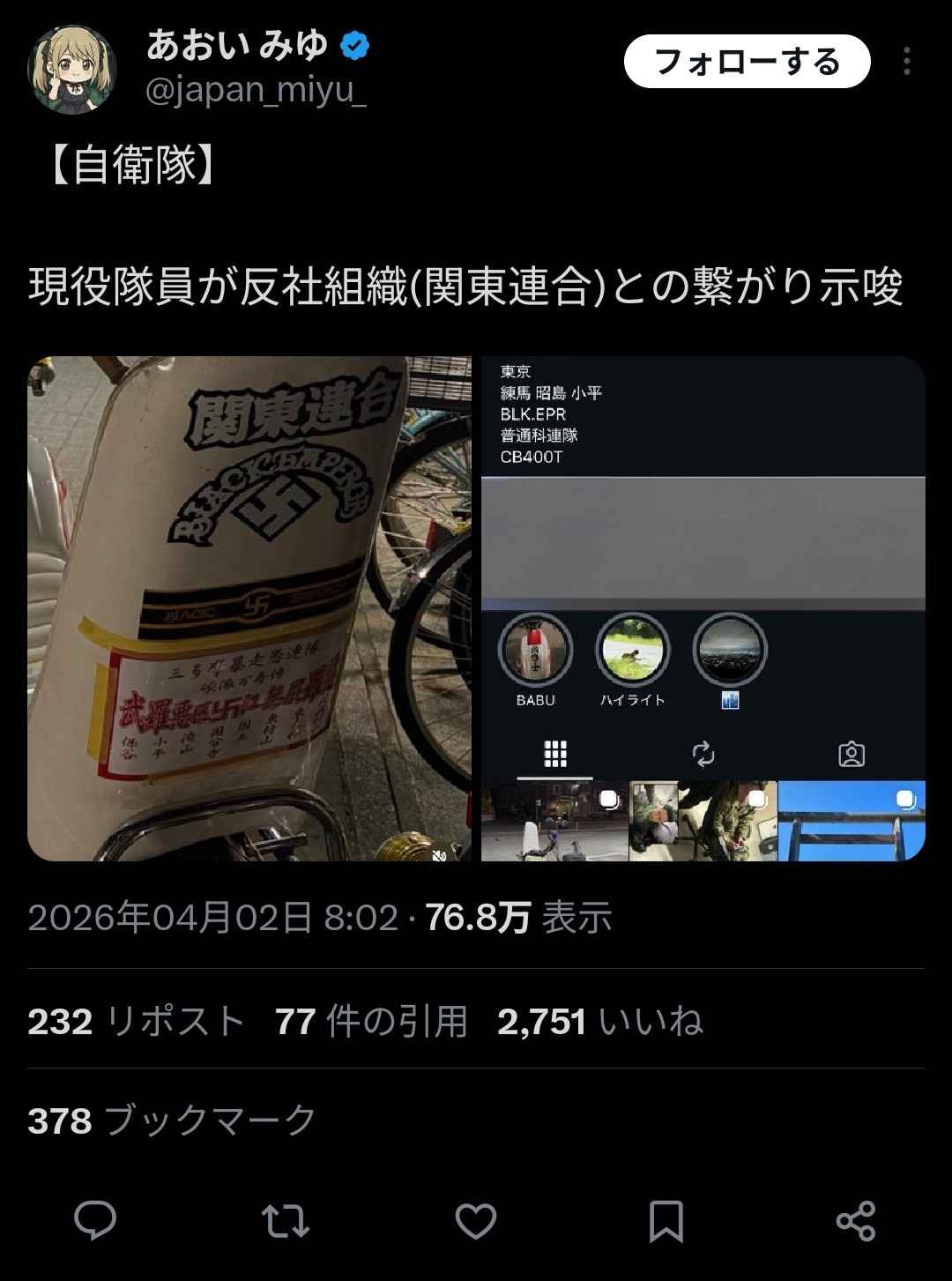 自衛隊、ガチの反社組織だった 現役自衛官に半グレのメンバー。バイクには鉤十字 靖国参拝の写真も