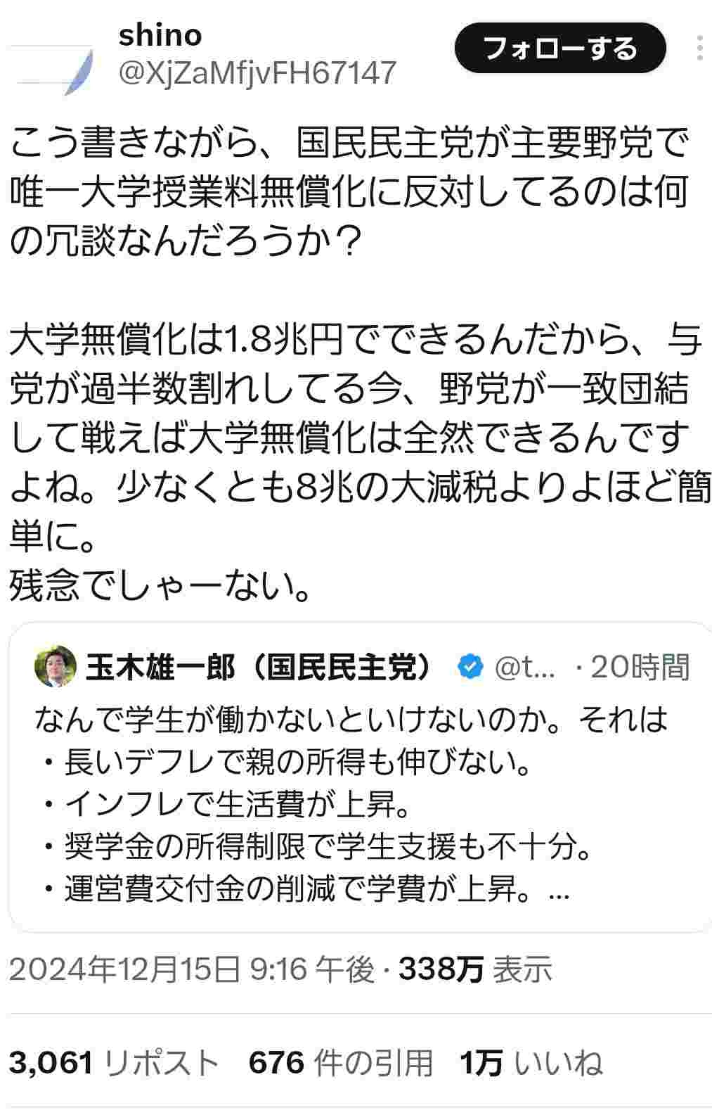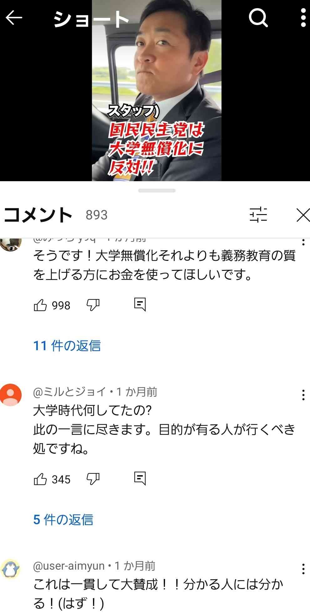 - 国民民主党の玉木が大学無償化に反対という公式のショート動画あるんやけど、コメント欄みたらその政策を絶賛してる奴らしかいなくて寒気がした
