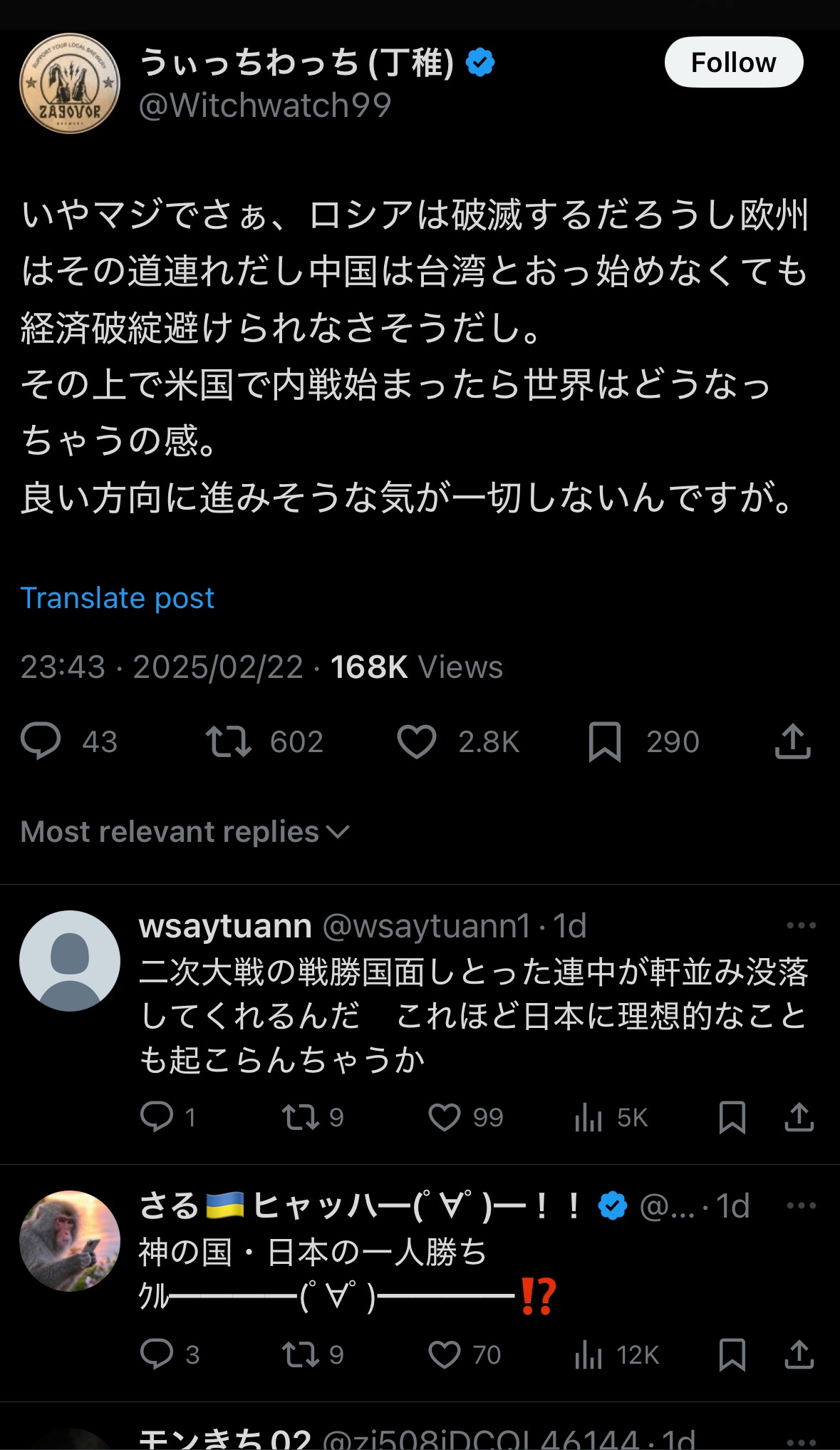 識者「ロシアは破滅するし欧州はその道連れだし、中国は台湾侵攻で破綻するし、アメリカは内戦になるしこの世界どうなっちゃうの?」