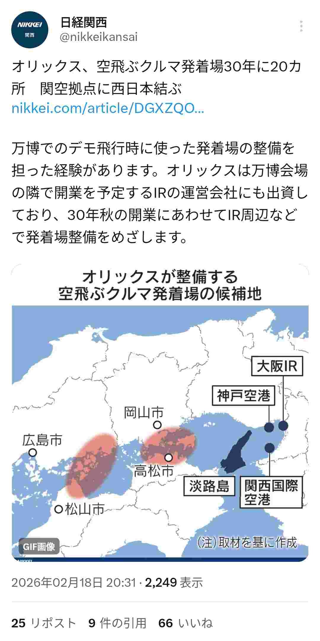 関西瀬戸内エリア、空飛ぶクルマの発着所を20カ所設置へ「万博で実証ができた」