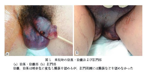 体温35.4℃,脈拍数91min,呼吸数27min。陰嚢,陰茎は暗赤色に変色し腫脹を認めるが,肛門周囲には腫脹などを認めなかった(図1―a,b)。下腹部に圧痛あるが,直腸診上圧痛なく腸音も異常を認めなかった。
