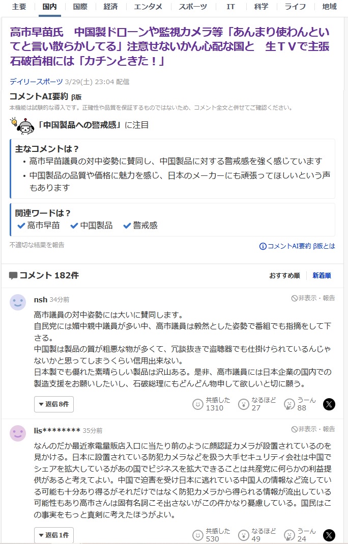 高市早苗「中国製ドローンや監視カメラは買うな😡」普通の日本人「防犯カメラから情報が中国に流出している😡」