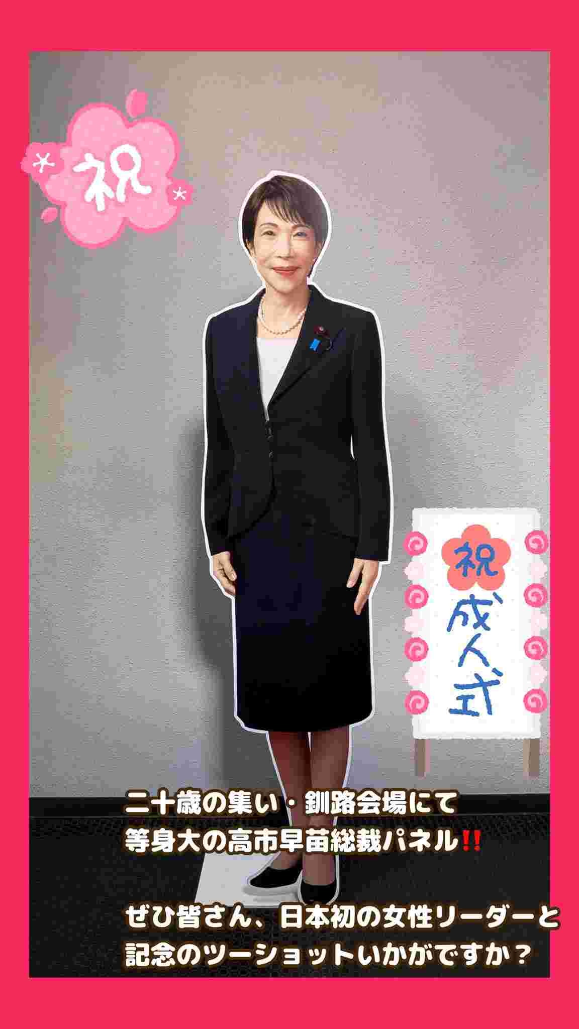 高市早苗に対する個人崇拝、ガチで始まる。高市早苗等身大パネルを成人式の会場に設置