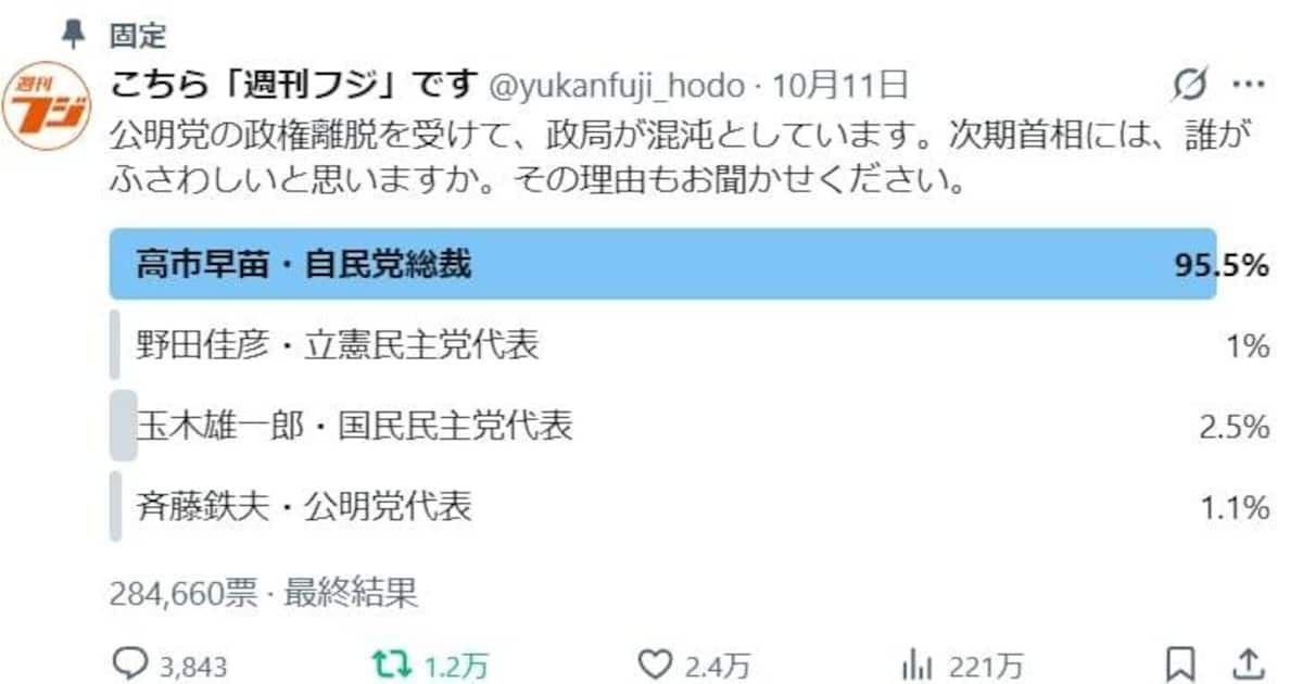 https://www.sankei.com/article/20251015-2GRFOISFLZPJZPXD7LMTUGDANY/混沌(こんとん)とする政局のなか、「次期首相には、誰がふさわしいと思いますか」とアンケートをしたところ、過去最高28万4660票もの投票があった。結果は、自民党の高市早苗総裁が95・5%でトップだった。