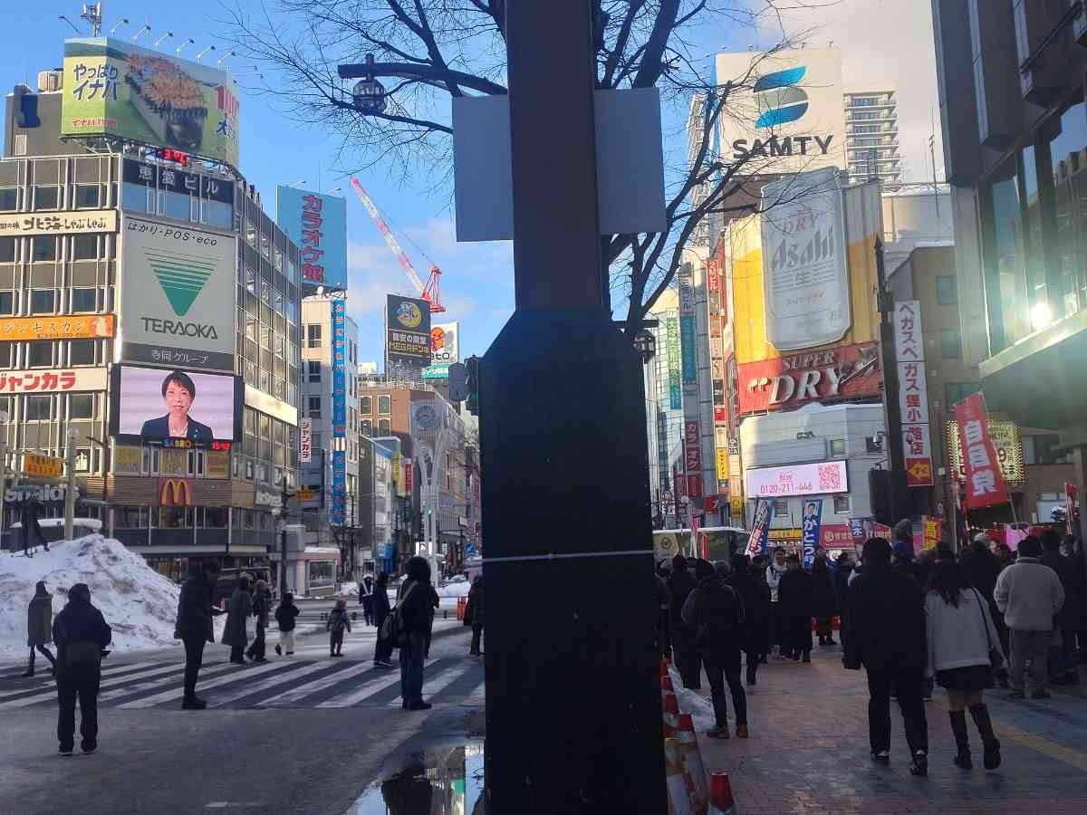 - さっぽろ雪まつりのすすきの会場に来たのだけど、すすきの交差点周りの電光掲示板が大半自民党に占拠されて無限リピート再生しており、さすがに恐怖の方が勝ってきた