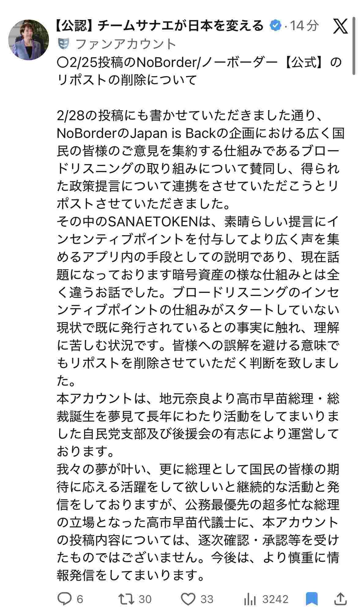 【公認】チームサナエが日本を変える (@TakaichiKoenkai) on X〇2/25投稿のNoBorder/ノーボーダー【公式】のリポストの削除について 2/28の投稿にも書かせていただきました通り、NoBorderのJapan isx.com - 2 : 2026/03/03(火) 18:12:19.76 ID:bI28o+BS00303