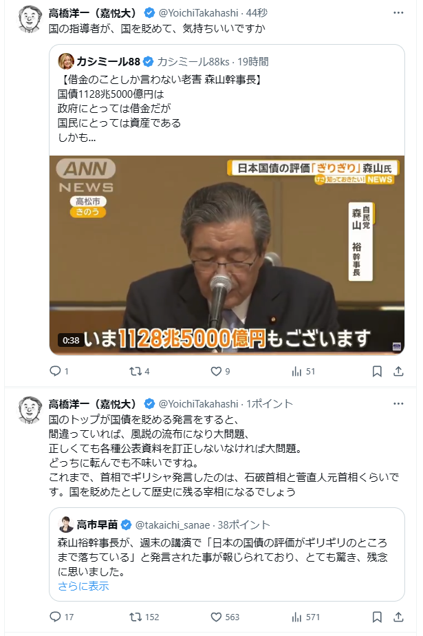 高橋洋一「減税したくない森山幹事長が国債を貶める発言は風説の流布、これまで首相でギリシャ発言は石破と菅直人くらい」