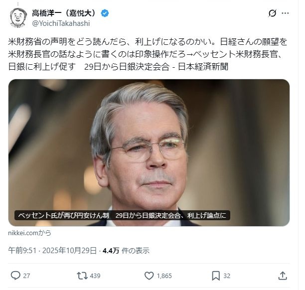- ベッセントのそのツイートも高橋の手にかかれば利上げ要求には見えないぞ