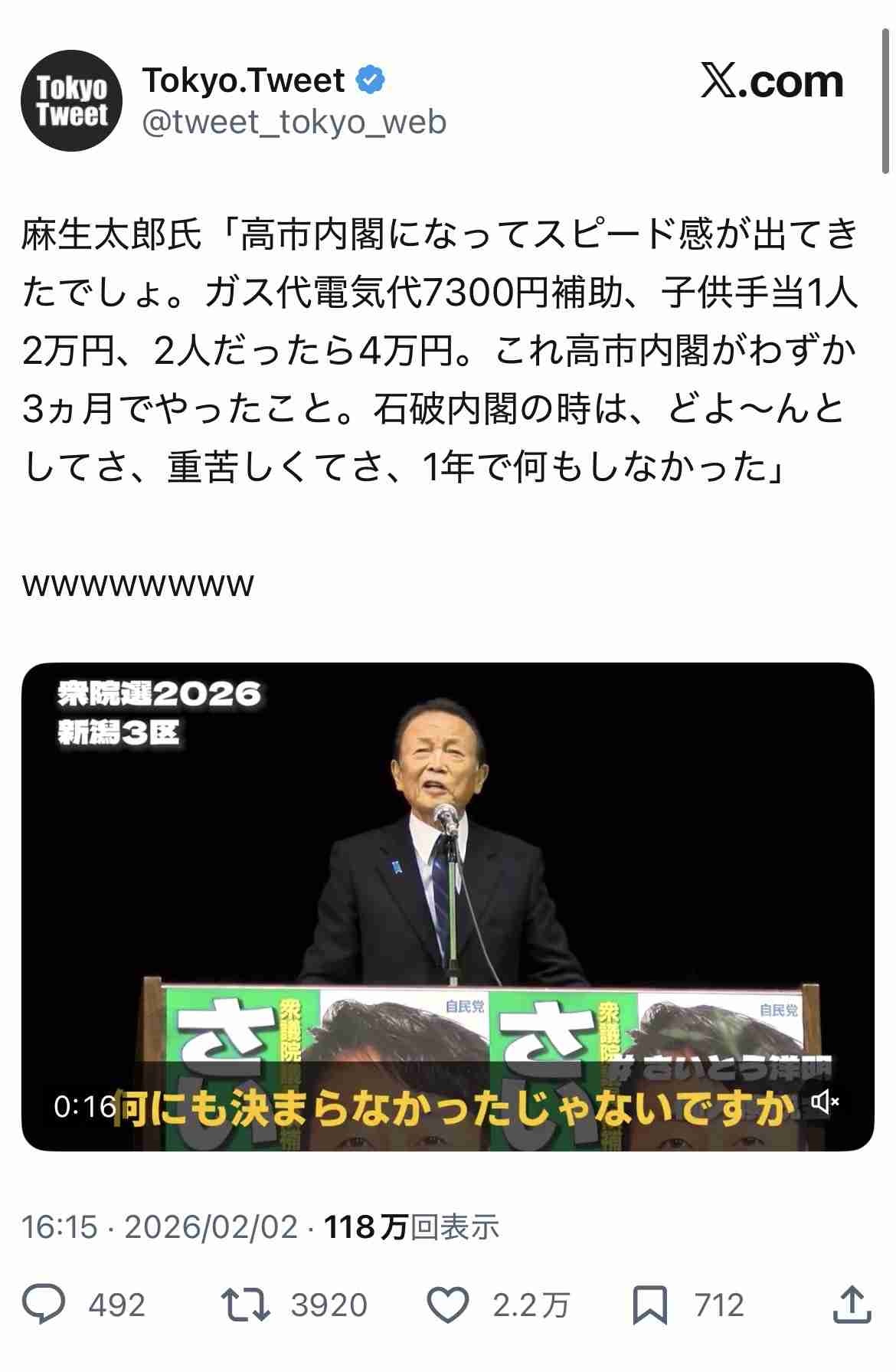 麻生太郎「高市になってスピード感が出てきたでしょ。高市は3ヶ月ですごい成果を上げている。石破の時はどよ~んとして何もしなかった」